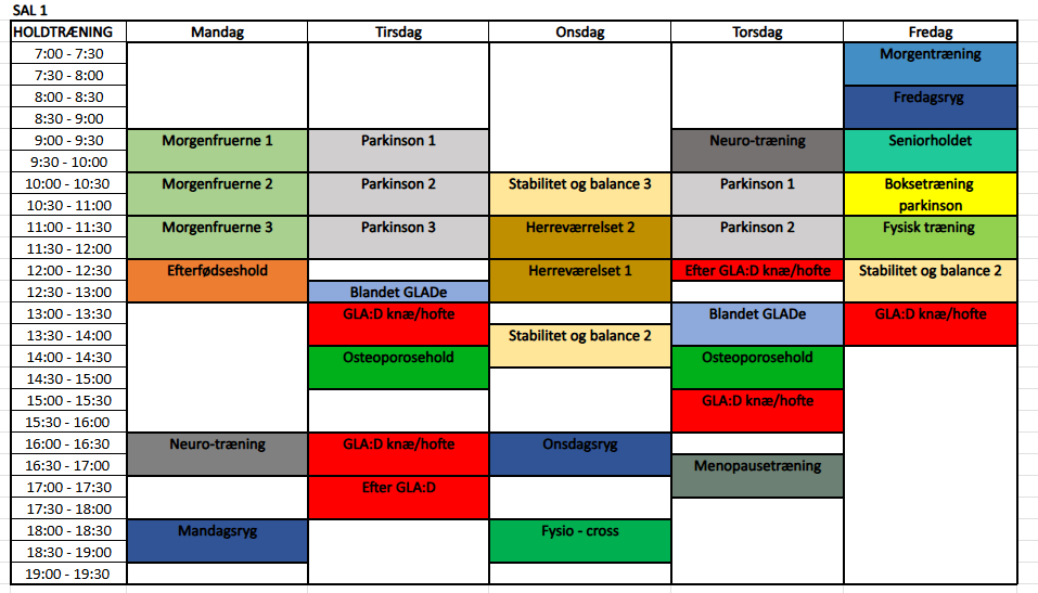 I tiderne angivet for holdtræning er indregnet 5-10 minutter til oprydning og opbrydning. Husk at medbringe eget underlag eller håndklæde til måtten, samt drikkedunk.