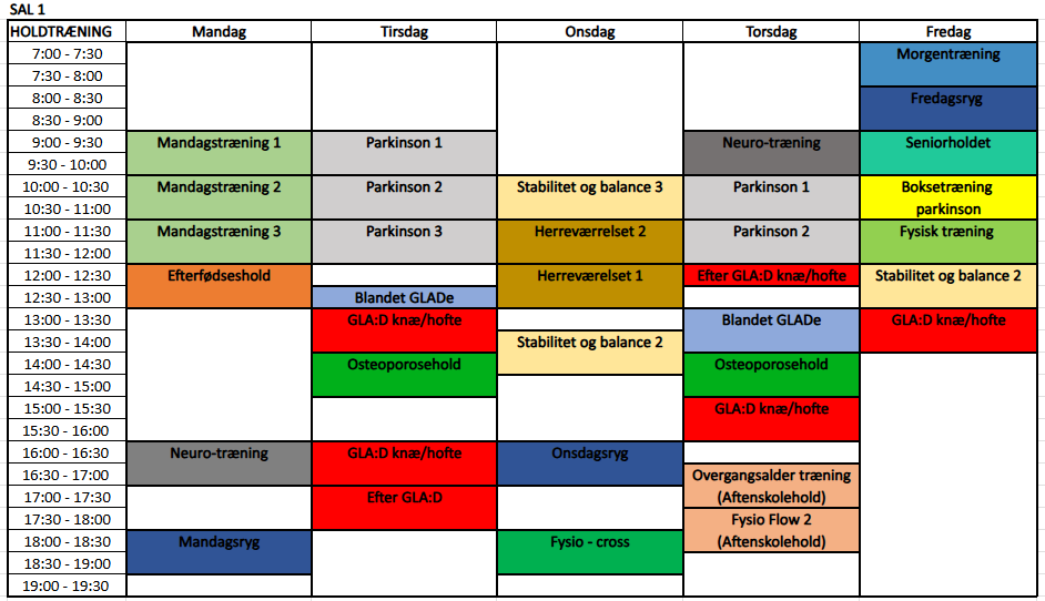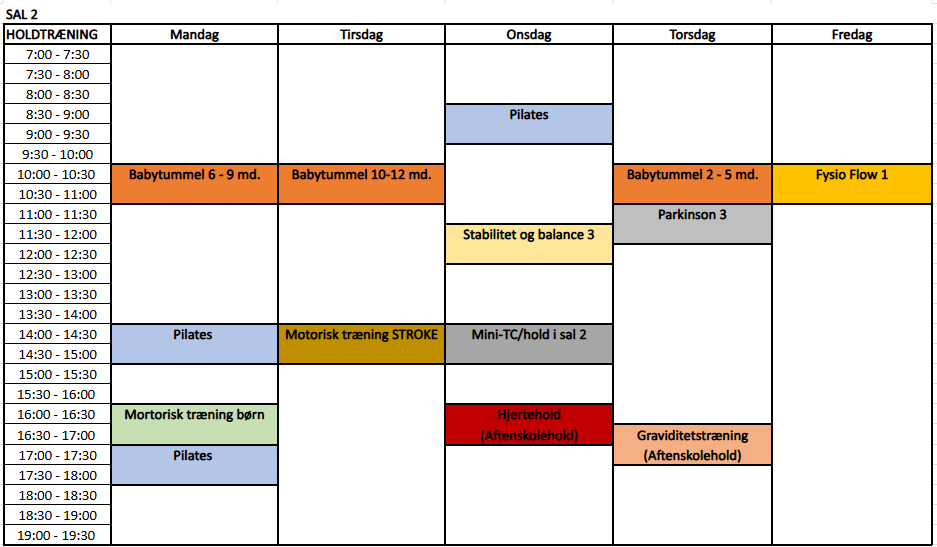 Alle deltagere skal inden opstart på hold mødes med fysioterapeuten til en konsultation, hvor der tilrettelægges behandlingsplan, kigges på individuelle behov og hensyn tages i betragtning. Nogle hold er niveaudelte andre er udvidede til flere hold af samme niveau. Kontakt klinikken hvis du har spørgsmål til holdtræning.